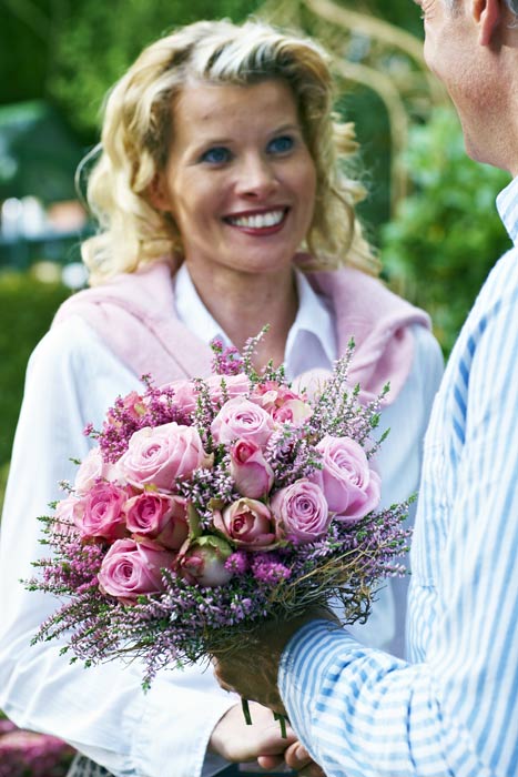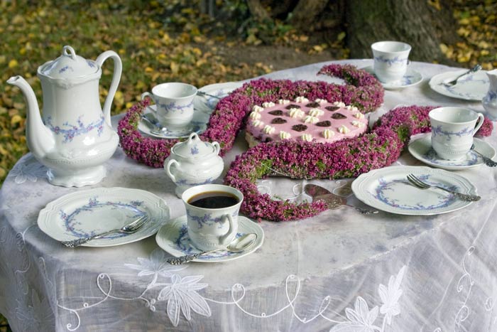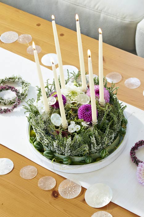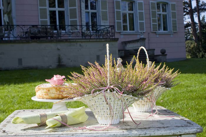 Zu Taufen oder Hochzeiten sind zarte Dekorationen in Weiß oder Rosa immer wieder besonders gefragt. Bei den vielfältigen Heidepflanzen hat man dabei die Wahl zwischen vielen, zum jeweiligen Anlass passenden Farben: von Schneeweiß bis Creme oder von Lachsfarben über Rosa bis zu Violett. Die feingliedrigen Erika- oder Callunenzweige unterstützen das festliche Ambiente als Gesteck, aber auch als Kranz oder zu Schnörkeln verarbeitet. Wickelt man die Zweige sehr eng, ergeben sich klare, moderne Formen. Legt man die Zweige locker umeinander, erhält man verspieltere Elemente. Besonders angesagt: Heide in Kombination mit Vintage-Geschirr.