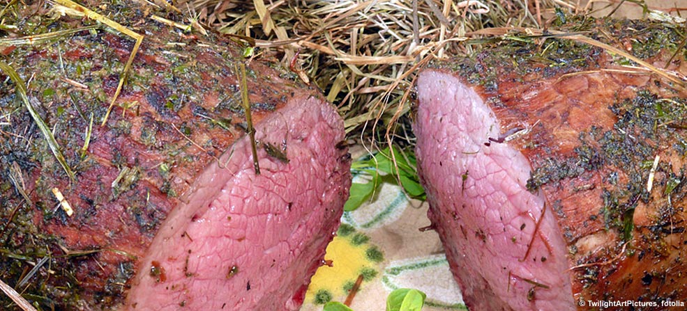 Frisches Wiesenheu, das aus getrocknetem Wiesengras, Klee und Kräutern besteht, duftet großartig. Bei diesem Bratengericht gibt es dem Fleisch eine besondere Würze, die an einen Sommer in den Alpen denken lässt. Dort hat die Verwendung von Wiesenheu eine lange Tradition: ob beim Räuchern von Schinken, dem Aromatisieren von Likören oder als entspannender Badezusatz. Mittlerweile gibt es das Heu auch auf gut sortierten Biomärkten zu kaufen.