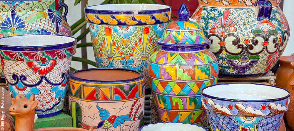 Keramik aus Mexiko versprüht südamerikanische Lebensfreude. In kräftigen Farben werden geometrische mit organischen Mustern oder Tierdarstellungen auf den Gefäßen, Tellern oder Fliesen miteinander kombiniert. Doch es gibt auch sehr zurückhaltende Werkstücke aus unglasiertem roten Ton, die eher tonal mit wenigen Farben gestaltet sind, etwa mit schwarzen und dunkelroten Ornamenten.