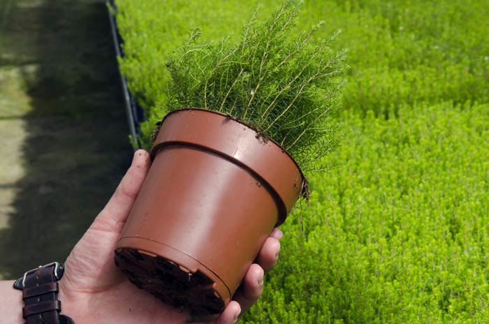 Neben Erica produzieren wir noch Callunen. Aber auch Gaultherien, Skimmien, Lavendel und Cornus als Bodendecker in verschiedenen Sorten und Topfgrößen.