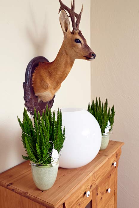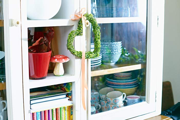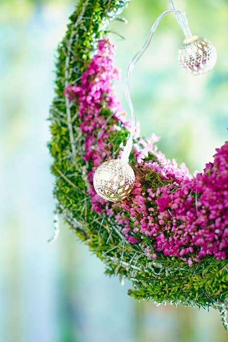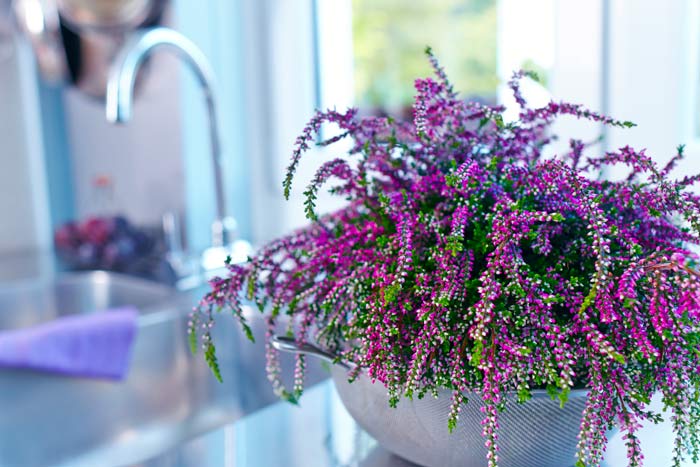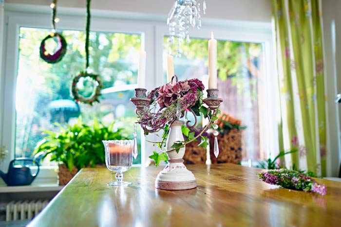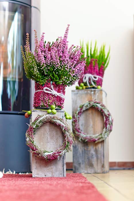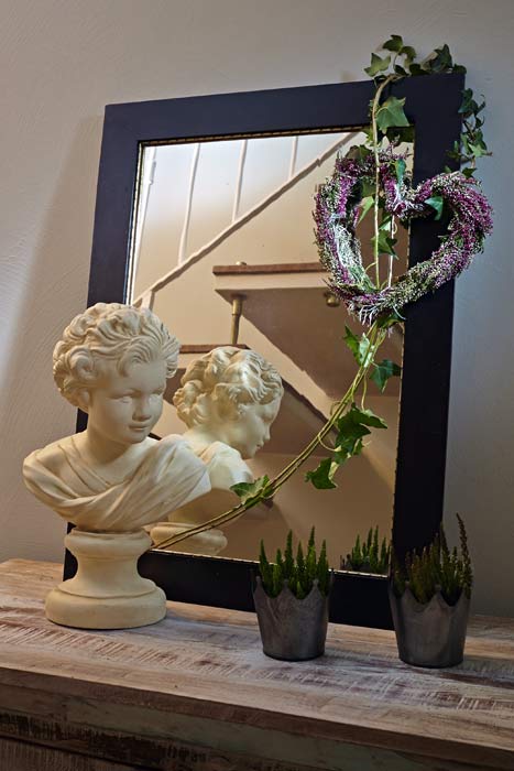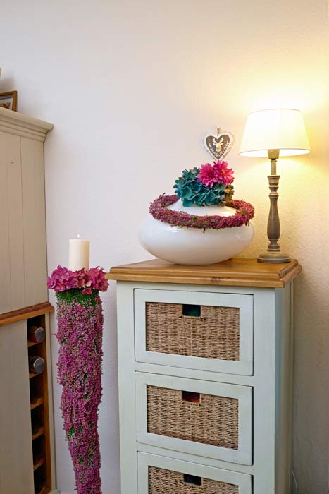 Eine Wohnung wird erst dann zum persönlich Markenzeichen, wenn dort Dinge sind, die nicht jeder hat. Manche Schränke sind langweilige Massenware ohne individuellen Charakter. Ein Herz aus grüner Heide am Griff verändert den Blick auf die weißgerahmte Scheibe jedoch schlagartig. Verloren wirkende Ecken, die zu schmal sind für ein farbiges Bild oder einen Beistelltisch, bieten immer noch genug Platz für eine floral dekorierte Stele. Wer zur Küche hineinkommt, dem sollen nicht als erstes Putzschwämme ins Auge stechen. Heide im Sieb ist originell und ein guter Anfang, darüber nachzudenken, welche Gegenstände noch zweckentfremdet werden können. Ein Bild? Wieso nicht selbst eines mit Heide „malen“? Nutzen Sie die vielen Möglichkeiten, die dieser ungewöhnliche Werkstoff Ihnen bietet.