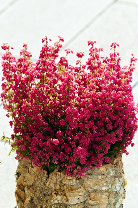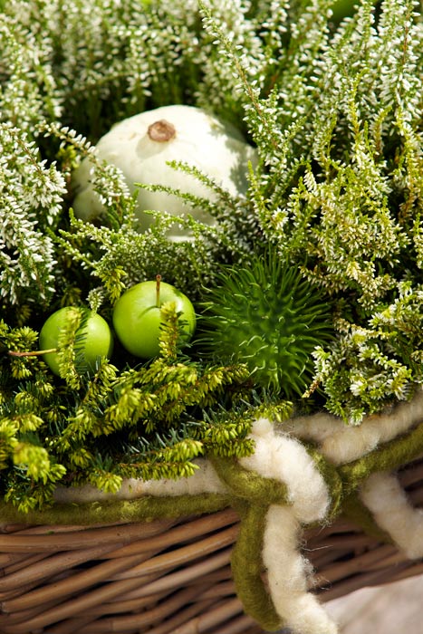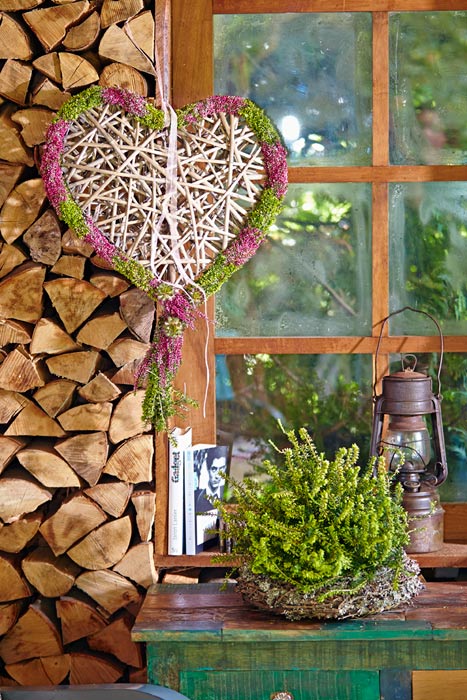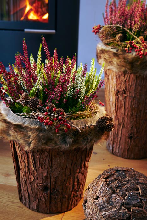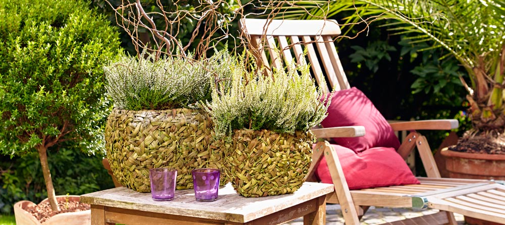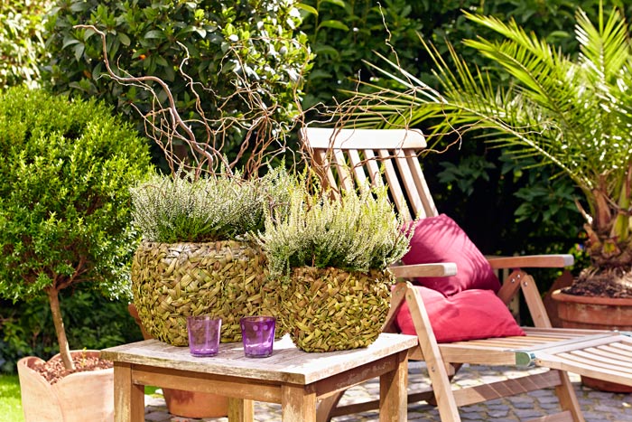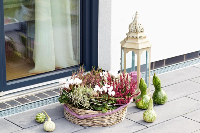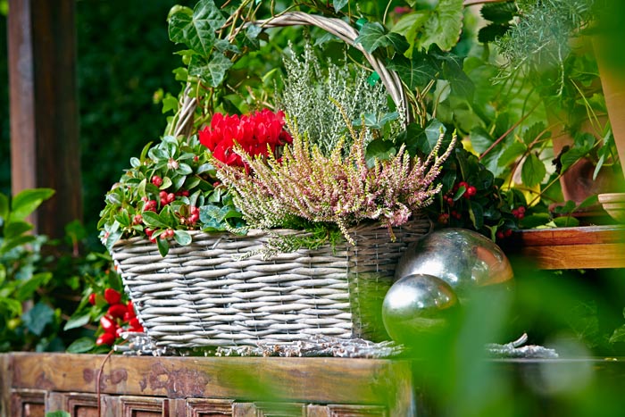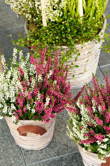 Heidepflanzen sind die passende Besetzung für Körbe, Kästen oder Kübel aus natürlichen Materialien. Die intensive Leuchtkraft der Heide steht in einem interessanten Kontrast zu den eher erdigen Farbtönen dieser Pflanzgefäße. Ob Heide pur oder mit passenden Pflanz-Partnern: Es lassen sich zahlreiche Kombinationen ausprobieren. Für kontraststarke oder Ton-in-Ton-Arrangements sind zum Beispiel rote oder weiße Alpenveilchen ideale Begleiter. Doch auch viele buntblättrige Herbststauden und Gräser können die Heide-Dekoration ebenso bereichern wie Zierkürbisse oder -äpfel.