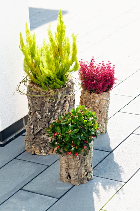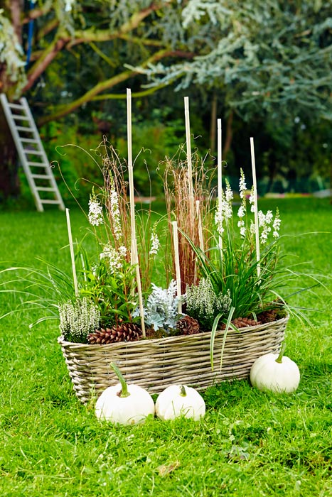 Wichtig ist bei diesen Gefäßen, dass immer ein Abzugsloch für überschüssiges Gieß- oder Regenwasser vorhanden ist. Im Handel werden Bastkörbe häufig mit einem Inlay aus Folie angeboten. Wenn man die Körbe im Außenbereich einsetzt, sollte die Folie am Boden des Korbs eingeschnitten werden. Bei der Bepflanzung sorgt dann eine etwa zwei Zentimeter dicke Schicht aus Granulat für eine gute Drainage. Heidepflanzen und ihre Begleiter können – anders als im Frühjahr – eng in Kästen und Kübel gepflanzt werden, da sie im Herbst nicht mehr so rasch wachsen. Dennoch sind sie lange haltbar, vielleicht bis zum ersten Schnee, der diese Arrangements ein letztes Mal veredelt.